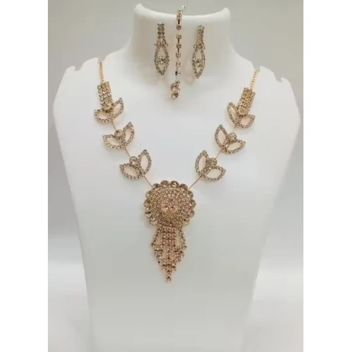 Designer gold plated diamond leaf design necklace with earrings and tika for girls and womens partywear