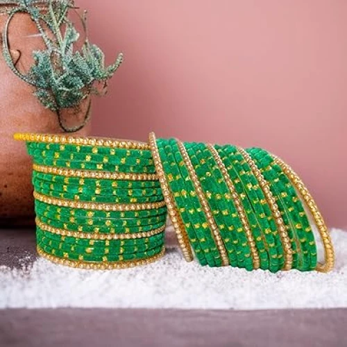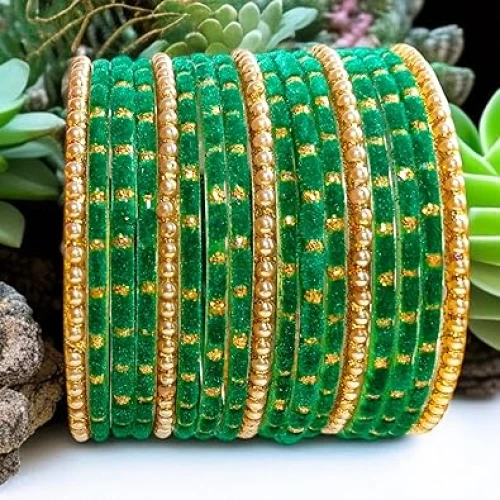 Fancy Velvet Glass Bangles Set with Golden Beads & Polka Dots for Women and Girls - Green