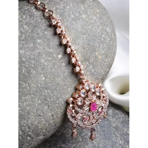 Karatcart Rose Gold Plated Pink American Diamond Studded Maangtikka. It is made with high-quality Kundan Stones which makes them very skin-friendly. Perfect for Weddings, Parties, Festivals, and Traditional Occasions. Gracefully pair Saree, Kurti, or any Indo-western outfit to enhance your look. These are made from toxic-free materials which are Anti-Allergic and Safe for the skin. It can be worn over long time periods without any complaints of itching and swelling. Package Contains | 1 Maangtikka Colour: Rose Gold Material: Skin Friendly Metal Alloy Maangtikka Length: 12.5cm, Width: 4cm |
