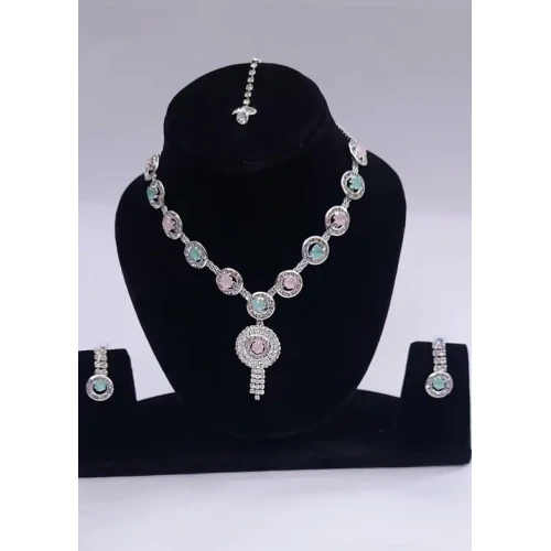 Radiant Zircon AD Stone Necklace Set – Elegant Pink & Green Jewelry for Women & Girls