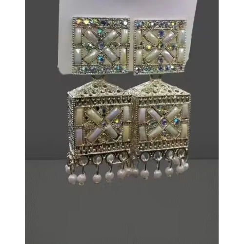 Make a striking statement with these exquisite chandelier earrings that seamlessly blend traditional craftsmanship with contemporary elegance. Each earring features a distinctive double-square design adorned with mother-of-pearl inlays and sparkling rhinestones in a mesmerising geometric pattern. The silver-toned metalwork showcases intricate filigree details, while the dangling pearl-like beads create a graceful cascade effect. These statement pieces measure approximately 7.5 cm in length, making them perfect for special occasions, festivities, or adding glamour to evening wear. The iridescent sheen of the mother-of-pearl catches light beautifully, while the multi-coloured crystals add a subtle sparkle. The detailed metalwork frames each square panel, creating a sophisticated lattice effect that draws attention to the luminous centre pieces. These versatile earrings complement both traditional Indian attire and modern evening wear, making them a valuable addition to any jewellery collection. DESIGN FEATURES